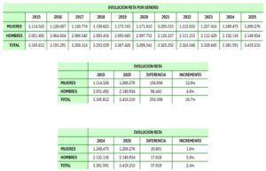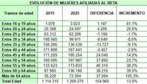 Centrándonos en la evolución del colectivo en la última década, el RETA ha sumado un total de 253.398 cotizantes desde diciembre de 2015, de los que 154.956 eran autónomas, frente a 98.442 varones. El crecimiento de las mujeres autónomas en la última década fue del 13,9%, frente al 4,8% que han registrado los varones. Es decir, el ritmo de crecimiento femenino triplica el de los varones.