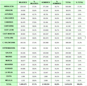 Por comunidades autónomas, todas mantienen un esquema donde el peso de los autónomos varones es superior al de las mujeres, aunque con diferencias territoriales notables. Asturias (41,7%) y Galicia (40,8%) siguen siendo las regiones donde el empleo autónomo femenino tiene mayor peso, consolidándose como las únicas que superan la barrera del 40%. Por encima de la media nacional (37,1%) se sitúan también el País Vasco (39,0%), Cantabria (38,9%), Canarias (37,8%), la Comunidad Valenciana (37,4%), Madrid (37,4%) y Andalucía (37,3%).