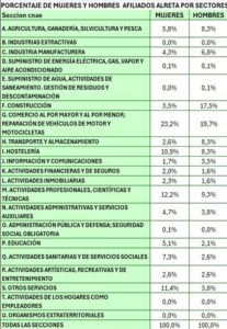 Las mujeres autónomas son porcentualmente más numerosas que los hombres en los sectores de comercio (23,2% mujeres frente al 19,7% de varones del total de autónomos en España), actividades profesionales, científicas y técnicas (12,2% mujeres frente al 9,3% de varones), hostelería (10,9% mujeres frente al 8,3% de varones), actividades sanitarias (7,3% mujeres frente al 2,6% de varones), educación (5,1% mujeres frente al 2,1% de varones), actividades administrativas (4,7% mujeres frente al 3,8% de varones), actividades inmobiliarias: 2,3% mujeres frente al 1,6% de varones, actividades financieras y de seguros (2,0% mujeres frente al 1,6% de varones).