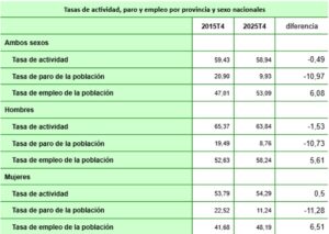 Es especialmente reseñable el análisis de la evolución en la última década (2015-2025). Mientras que la tasa de actividad masculina ha retrocedido 1,53 puntos en estos diez años, la de las mujeres ha sido la única que ha experimentado un crecimiento positivo (+0,5 puntos). Además, destaca la drástica reducción de la tasa de paro femenina, que ha pasado de un preocupante 22,52% en 2015 a situarse en la mitad (11,24%) en la actualidad, demostrando una capacidad de absorción de empleo muy superior a la media