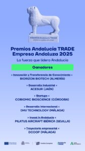 Por categorías, la elegida en ´Innovación y Transferencia de Conocimiento´, ha sido Biorizon Biotech, de Almería; en la de `Desarrollo Industrial´, Acesur (Aceites del Sur-Coosur) de Jaén; en ´Startups´, Cobiomic Bioscience de la provincia de Córdoba; en `Desarrollo Internacional´, la empresa DHV Technology, de Málaga; en la de ´Invest in Andalucía´, la firma Pilatus Aircraft Ibérica (Sevilla); y en ´Trayectoria Empresarial´, Dcoop, de Málaga.